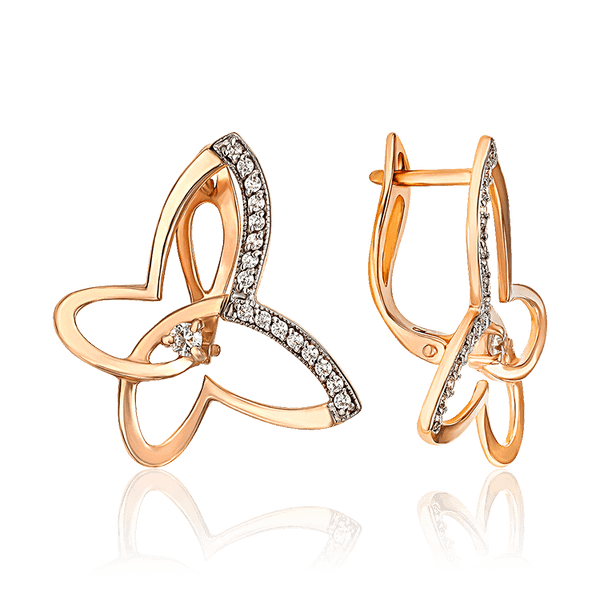 Молодежные сережки могут позволить себе самые оригинальные дизайны. Как бабочки из красного золота 585 пробы. Тонкие линии металла плавно повторяют изгибы мотылька. Вставки из белых фианитов на фоне белого золота привлекают солнечные блики. Английский замок позволит быстро и легко надевать украшение для прогулки или активного дня.