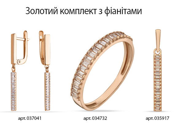- прямокутні фіаніти в поєднанні з червоним золотом створюють ефект розкішної прикраси, яка виглядає набагато дорожче, ніж коштує. Це робить комплект чудовим вибором для тих, хто хоче виглядати елегантно і стильно без надмірних витрат