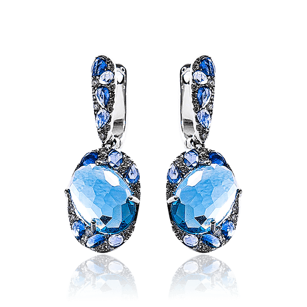 Яркие, стильные и модные золотые серьги с бриллиантами, сапфирами и Лондон топазом. Ювелирное украшение имеет центральную вставку в овальной форме из синего камня Лондон топаз. Вокруг него и на тыльной стороне застежки расположились вставки из мелких белых и синих драгоценных камней. Замок в серьгах установлен – английский. Изготовлен аксессуар из качественного и долговечного белого золота 585 пробы. Серьги подойдут как под вечерние наряды, так и для деловых переговоров. Дополнительно на сайте в комплекте к ним можно купить золотое кольцо с таким же дизайном.