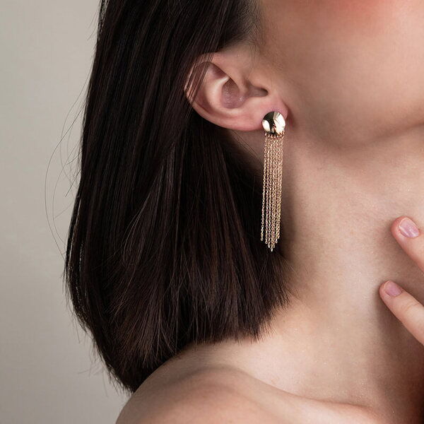 Элегантные серьги изготовлены из золота 585 пробы красного цвета и оснащены надежным английским замком. Основа выполнена в форме утонченного круга, с которого стекают тонкие цепочки. Они заворажиюще покачиваются, привлекают внимание к своей обладательнице. Длинные серьги всегда отличаются особым шармом и роскошью. Ювелирное украшение гармонично дополнит вечерниц образ.