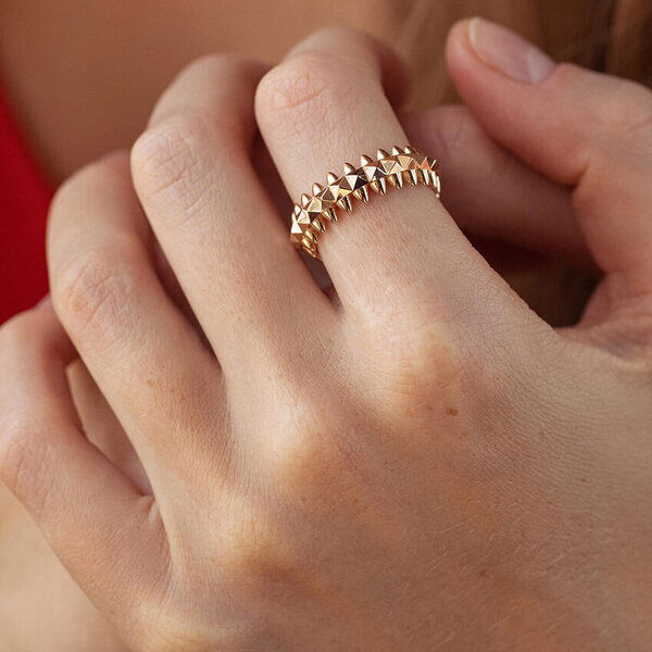 Кольцо с шипами и алмазными насечками - одно из тех уникальных украшений, которые не нуждаются в драгоценных вставках. Благодаря граненой поверхности золото сияет не хуже ювелирных камней, создавая дерзкую и харизматичную роскошь с налетом бунтарства.
