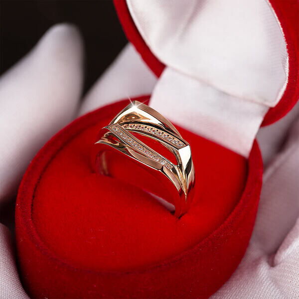 Незвичайна каблучка з трендового червоного золота 585 проби є єдиною композицією. Лицьова сторона складається з чотирьох елементів, два з яких мають вставки білих фіанітів. Два зовнішніх обідка химерно вигнуті. Виріб здається застиглим посеред руху, яскраво підкреслюючи стиль святкового життя власниці.
