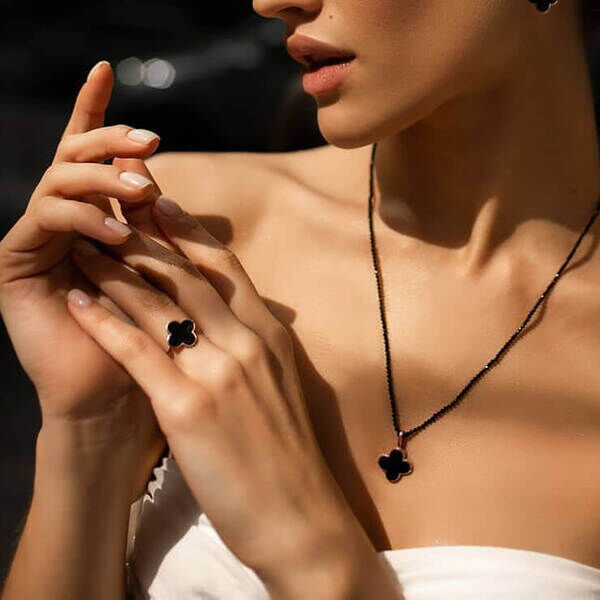 Елегантне та стильне жіноче золоте кольє з чорним агатом та емаллю «Клевер». Ланцюжок ювелірної прикраси виготовлений з чорного агата. Застібка намиста зроблена з благородного дорогоцінного металу – червоного золота 585 проби. Також виріб має золотий кулон у формі конюшини з чорною емаллю. Таке кольє було створено ювелірними майстрами, щоб зробити образ жінки розкішним, але в той самий час загадковим.