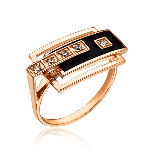 Каблучка золота в геометричному дизайні з чорною емаллю і фіанітами 033907