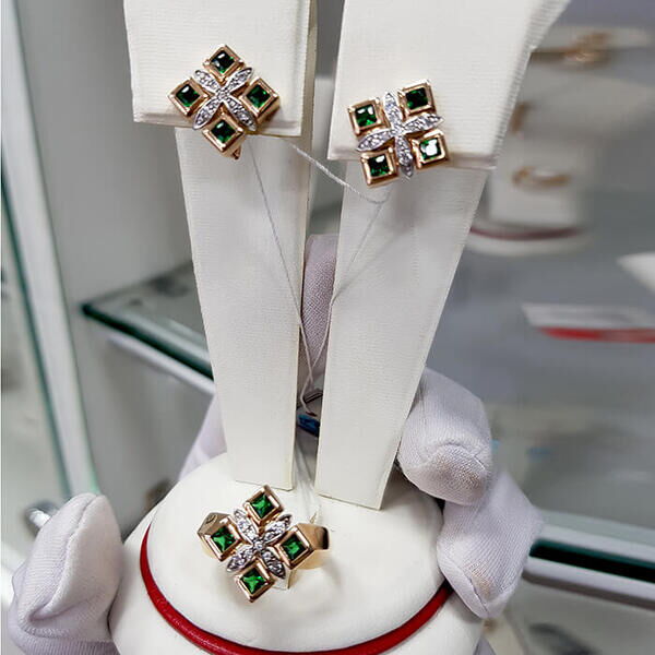 Розкіш та багатство втілилися в даній жіночій золотій каблучці з комбінацією вставок зі смарагдів та фіанітів. Масивна основа ювелірного виробу виготовлена з благородного золотого сплаву червоного відтінку та має 585 пробу. Дизайн каблучки має ромбоподібну форму, де в центрі розмістилися вставки з білих фіанітів, а по чотирьох боках – зелені смарагди. Додатково в комплекті можна купити сережки з таким же дизайном, щоб створювати розкішні вечірні образи.