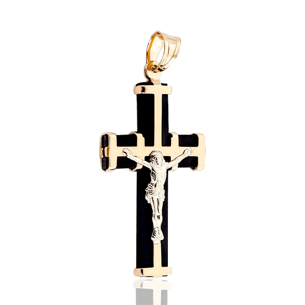 - цей кулон являє собою хрест, виконаний в комбінації чорного та золотого кольорів, із зображенням розп'яття Ісуса Христа в центрі