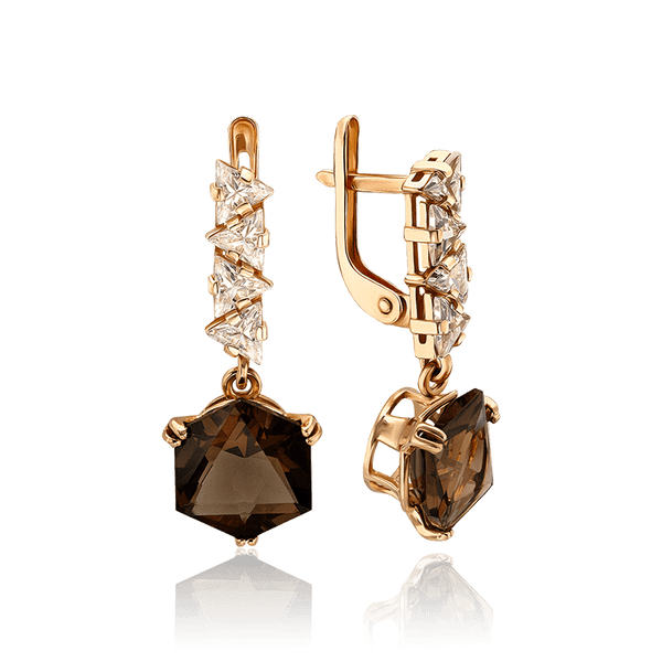 Жіночі золоті сережки підвіски з димчастим кварцем і фіанітами 035884