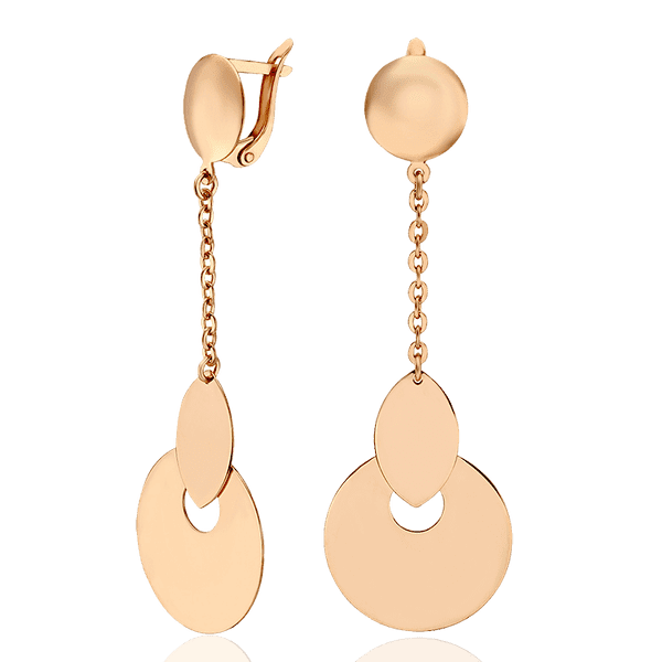 Цікаві геометричні сережки на англійській застібці виготовлені з високопробного золота в червоному кольорі металу. Основа сережок – об'ємне коло, яке декоровано якірним ланцюжком з геометричними елементами. Ювелірну прикрасу рекомендується носити дівчатам з овальними, трикутними й квадратними рисами обличчя. Сережки Глянець гармонійно впишуться в будь-який образ, в якому є відчуття стилю і бездоганного смаку.